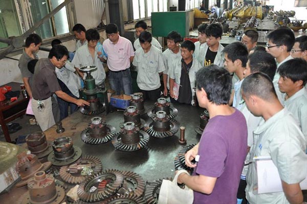 本次研討學(xué)習(xí)班共有來自全國各地區(qū)共計40名的一線服務(wù)人員參加。此次學(xué)習(xí)班,引起我司領(lǐng)導(dǎo)高度重視,不僅組織了相關(guān)部門領(lǐng)導(dǎo)系統(tǒng)授課:從新品介紹到各個機型的特點,從發(fā)動機故障判斷維修到管路液壓件原理介紹,從制動系統(tǒng)學(xué)習(xí)到油缸的拆裝;而且與相關(guān)配套廠商協(xié)商,組織全體學(xué)員到相應(yīng)的工廠系統(tǒng)學(xué)習(xí)驅(qū)動橋、變速箱、變矩器等主要零配件安裝維護課程!